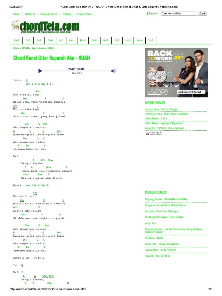 Berikan penilaianmu dengan menekan rating bintang pada bagian atas artikel. By sitikhalifah90 december 29, 2012. G a bm aku ingin kau merasa a d a bm kamu mengerti aku mengerti kamu g a bm aku ingin kau sadari em g f# cintamu bukanlah dia. Back | video and audio performances by our users (0). Learn to play guitar by chord / tabs using chord diagrams, transpose the key, watch video lessons and much more. Kau merasa g c kamu mengerti aku g/b am mengerti kamu. D bm d d em g. Noah (sebelumnya bernama peterpan), adalah sebuah grup musik pop/rock alternatif dari bandung, indonesia. intro : d bm a d em g bm a d em g. Dilihat dari liriknya, lagu 'separuh aku' ini bercerita tentang seseorang yang merindukan kekasihnya yang pergi. Separuh aku (chord _lyrics)dipopulerkan oleh : Separuh aku chords by noah. Chord lagu separuh aku noah.